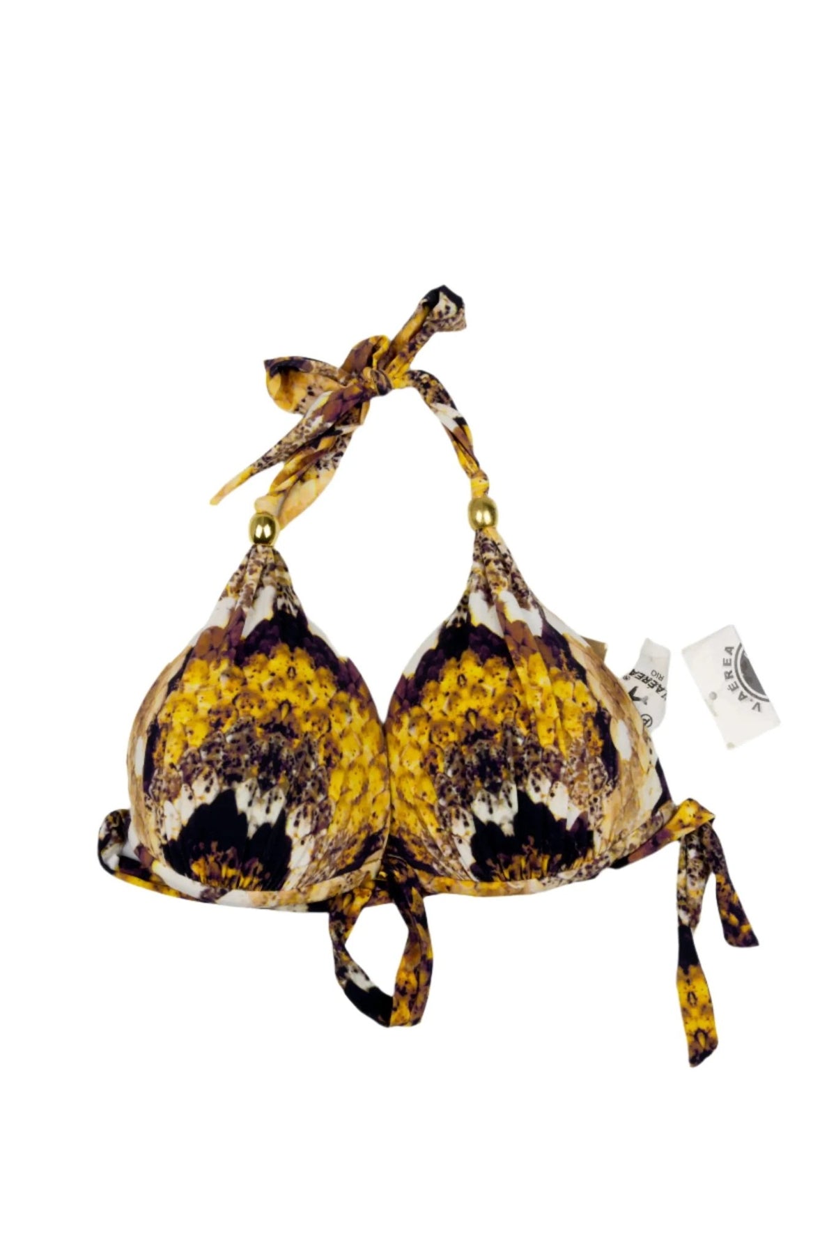 Bikini parte de arriba con copas, amarillo ocre con diseño de flor jaspeada en capas, negra, blanca y marrón, dos bolitas doradas al tope de busto.