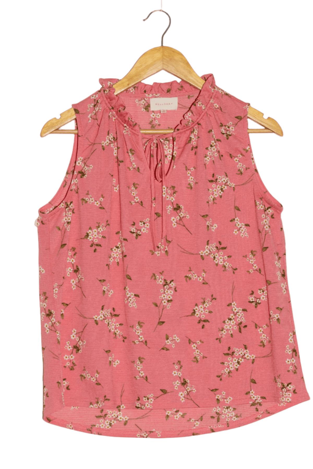 Blusa de tela con textura, fresca, rosadobebé con flores pequeñas, manga cero, cuello con recogido circular con pita para amarre. Busto 116 cm. largo 59 cm.