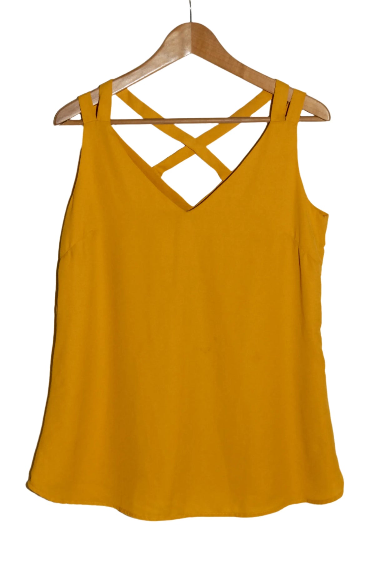 Blusa Marquis mostaza con tiras que cruzan en la espalda, cuello en "V". Busto: 100cm, largo: 58cm.
