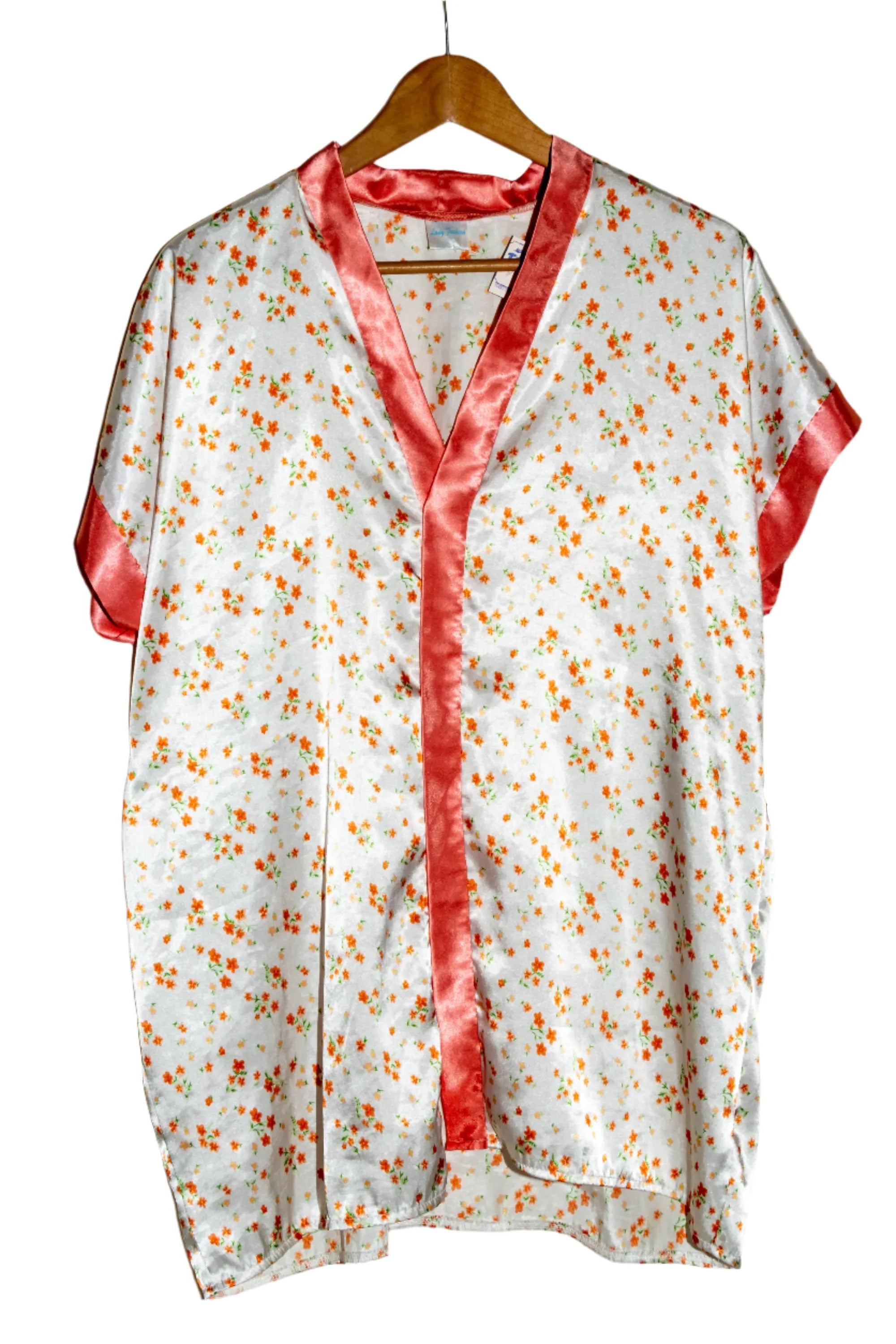 Camisón en seda de color blanco con pequeñas flores naranjas con verde, manga corta ,bordes en satin naranja , busto: 61 cm, largo: 76 cm