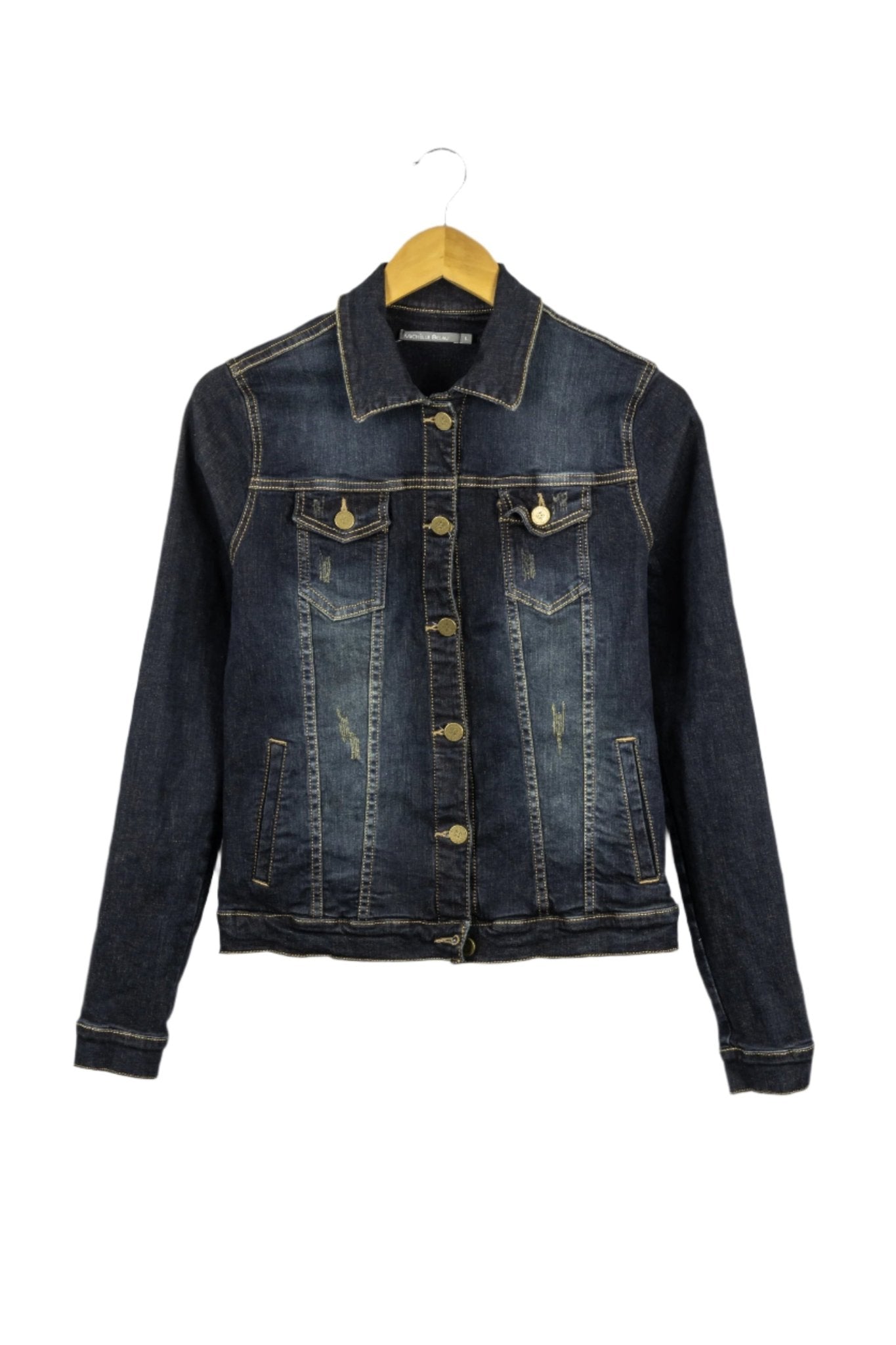 Casaca jean Michelle Belau con bordado dorado con 2 bolsillos en pecho y 2 en cintura