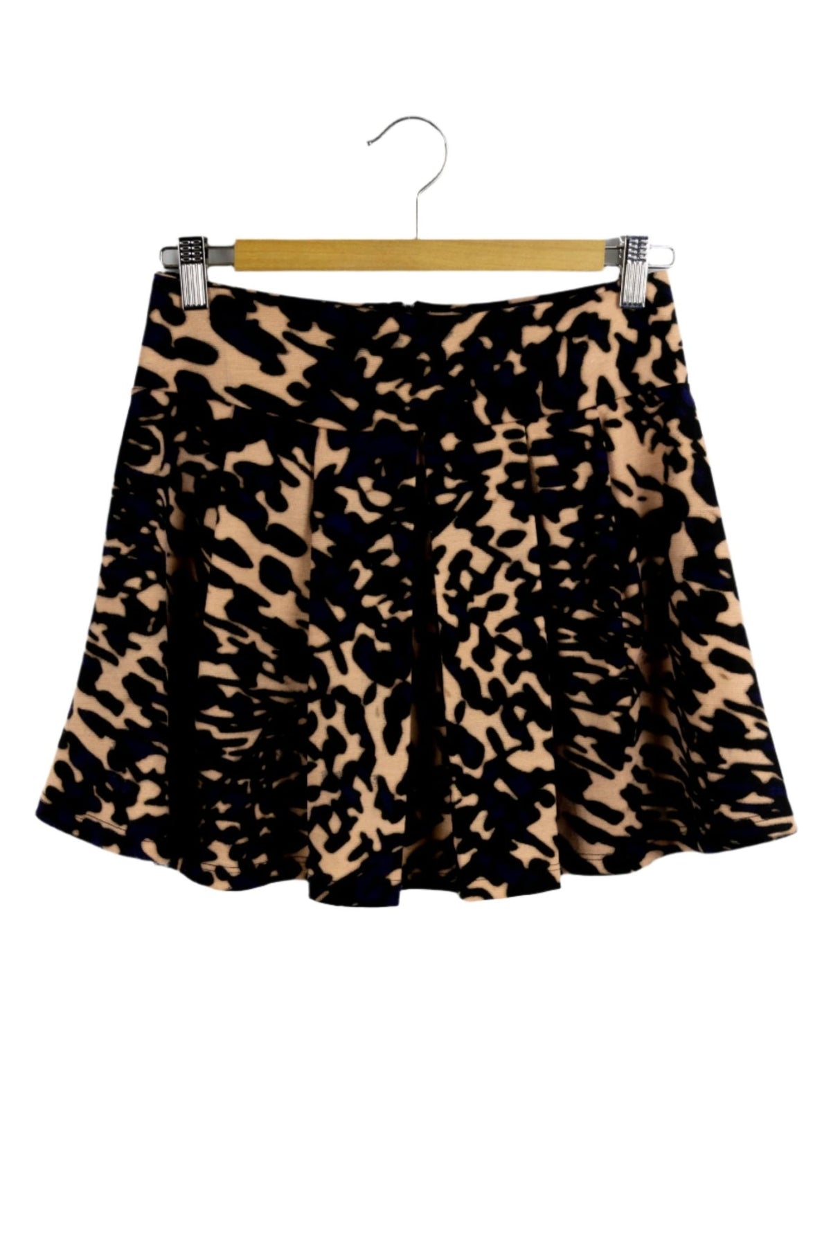 Falda plizada corta Rock Papaya estampado de camuflaje rosa, negro y morado, pretina ancha de 8cm de alto y cierre invisible posterior negro de 15 cm. Cintura: 65cm. Largo: 38.5 cm.