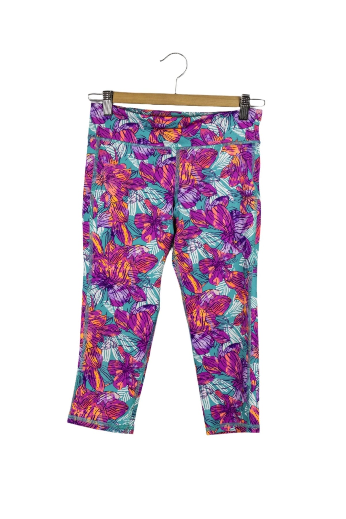 Leggings deportivas hasta la rodilla Old Navy, fondo turquesa con flores moradas y diseños blancos. Cintura: 64cm, largo: 62cm