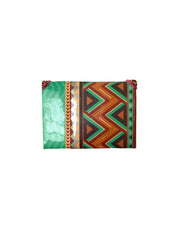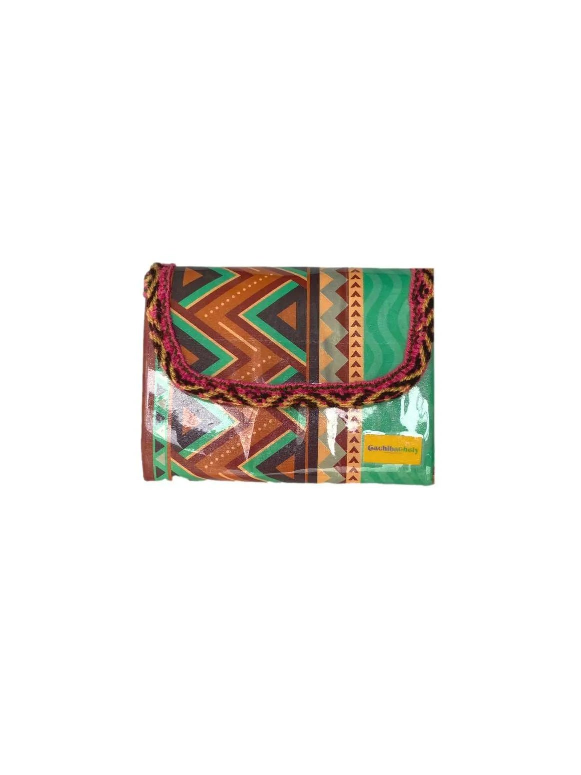 Monedero artesanal de figuras tribales en tonos marrones y verdes y detalle de bordado, broche a presión para cerrar. Ancho 10 cm. largo 8 cm.