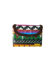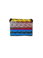 Monedero artesanal de figuras tribales multicolores y detalle de bordado, broche a presión para cerrar. ancho 10 cm. largo 8 cm.