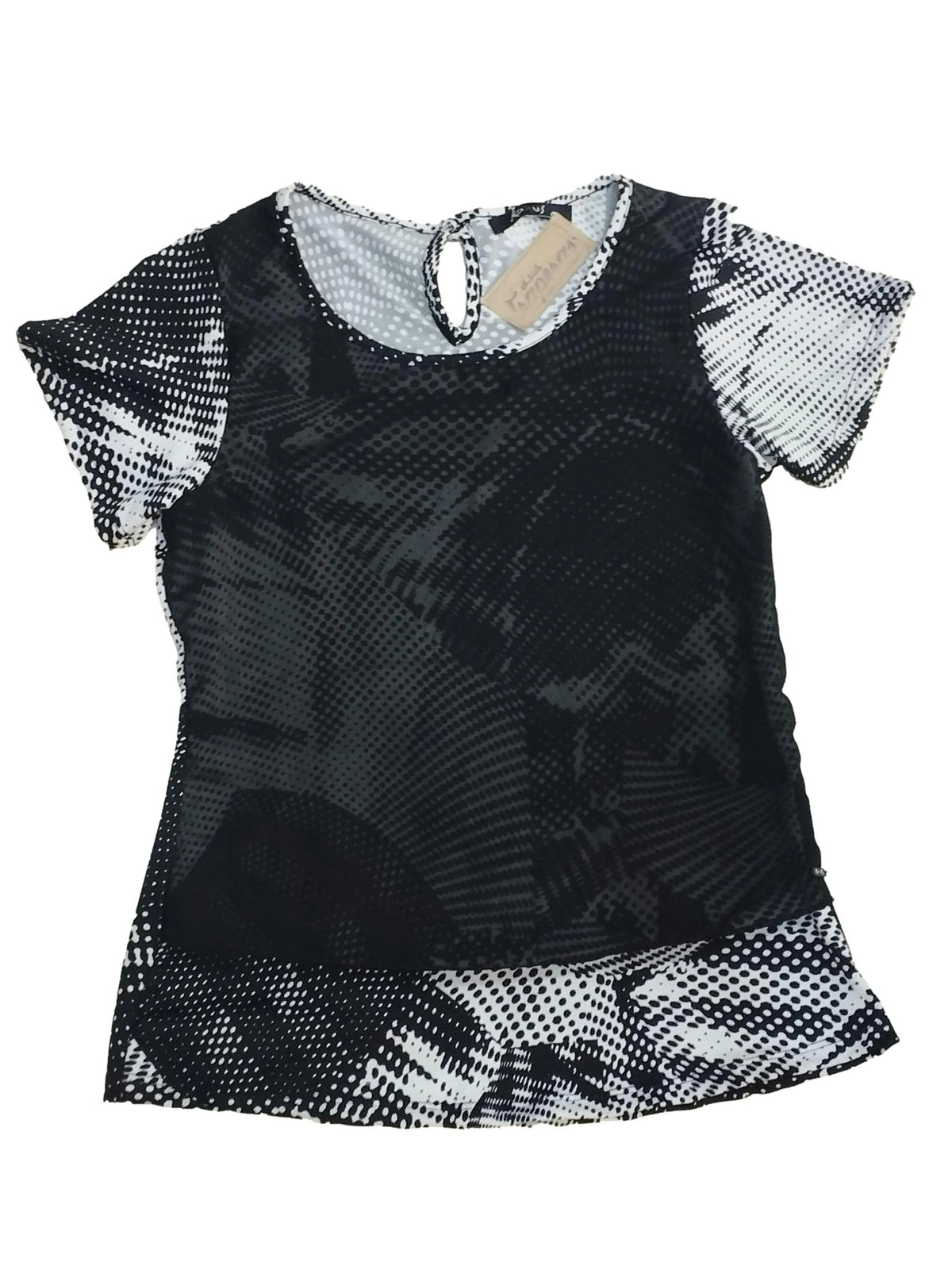 Polito Oxus con estampado a blanco y negro, aplicación de mesh negra delantero, ligeramente stretch, botón posterior. Busto: 82 cm, Largo: 60 cm