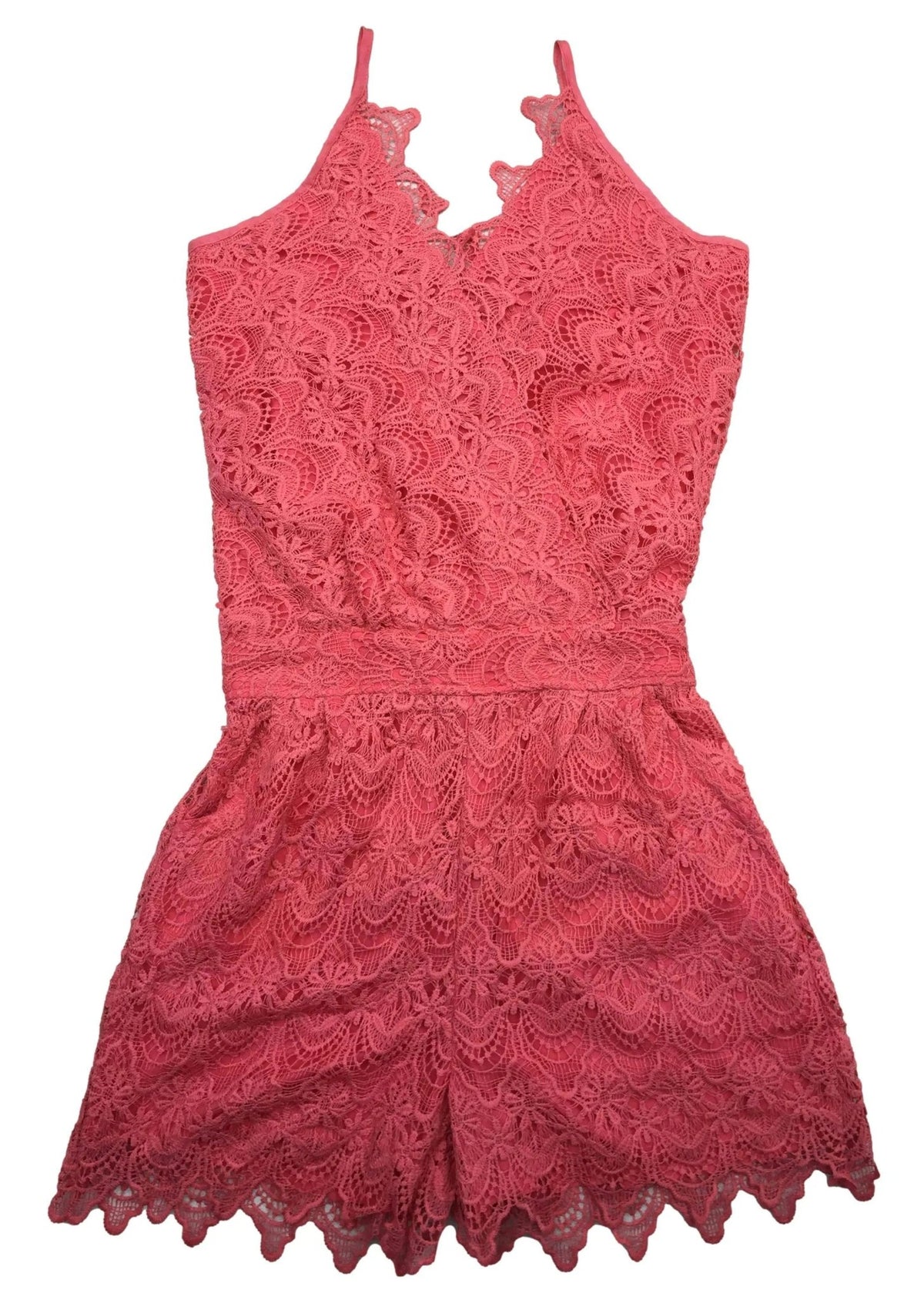 Romper de encaje coral, forrado, tiritas regulables, bolsillos en short, cintura y espalda elásticas. Busto 100cm Largo 90cm