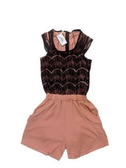 Romper nude, con encaje en la parte del pecho y espalda, con bolsillos y cierre en la espalda, sin mangas. Busto: 78 cm. Tiro: 27 cm. Largo: 81 cm.