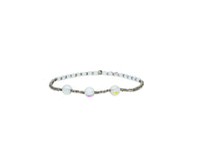 Tobillera con chaquiras color plata y cuentas blancas de cristales/vidrio tornasol.