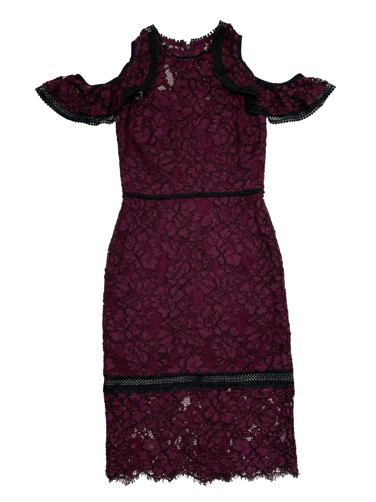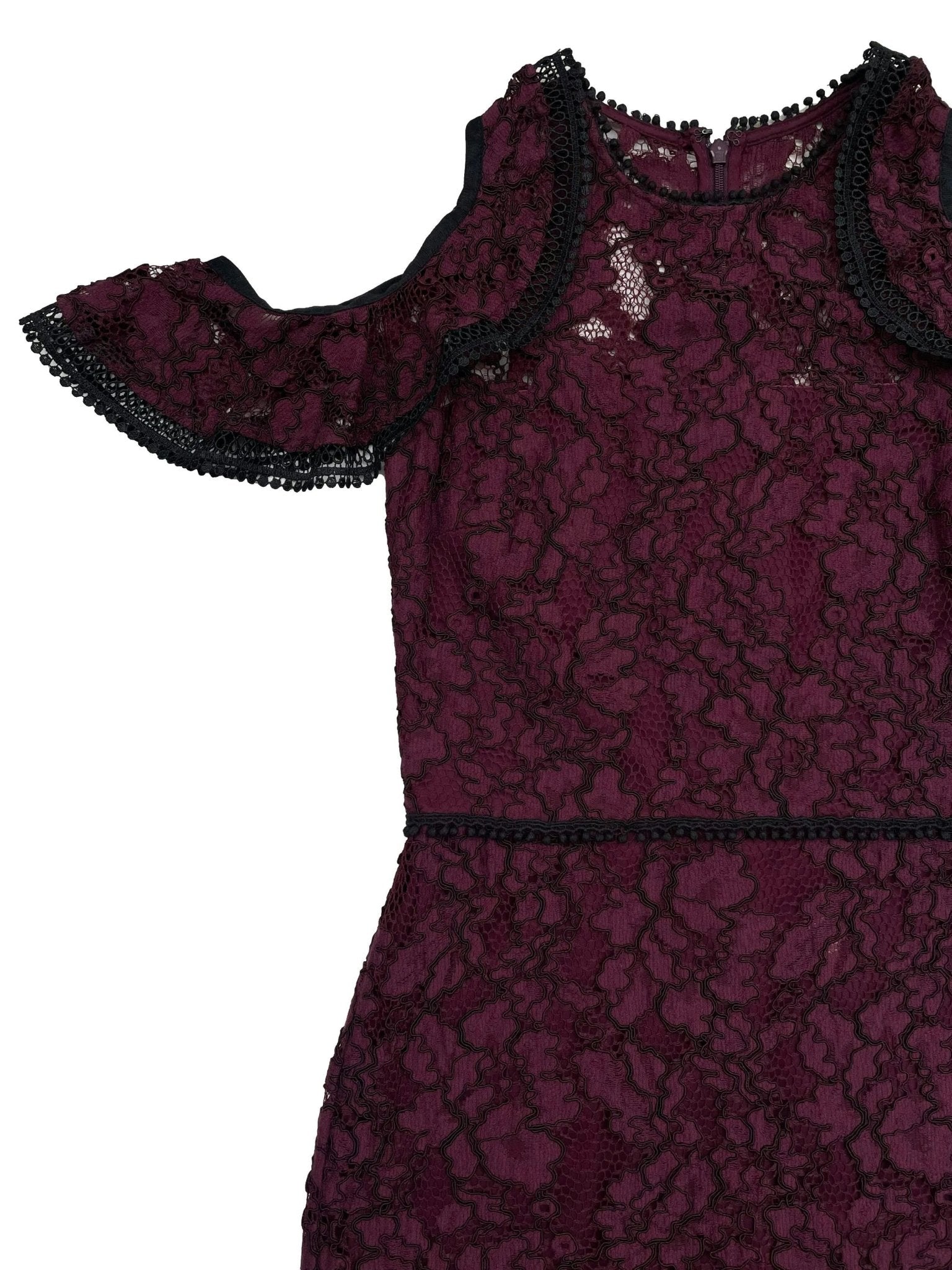 Vestido Alexis de encaje morado y negro, forrado, volante en hombros y cierre invisible posterior. Busto 80cm sin estirar Cintura 66cm Largo 100cm. Precio original S/ 1000