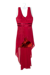 Vestido de fiesta guinda, escote profundo en v, espalda tipo corset, vuelo abierto en basta, pretina ancha en cintura. Busto 90 cm. largo 128 cm.
