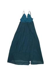 Vestido de gasa con tiras, color verde turquesa, encaje en busto y espalda. Doble forro, espalda descubierta. Busto: 78 cm. Largo: 158 cm.