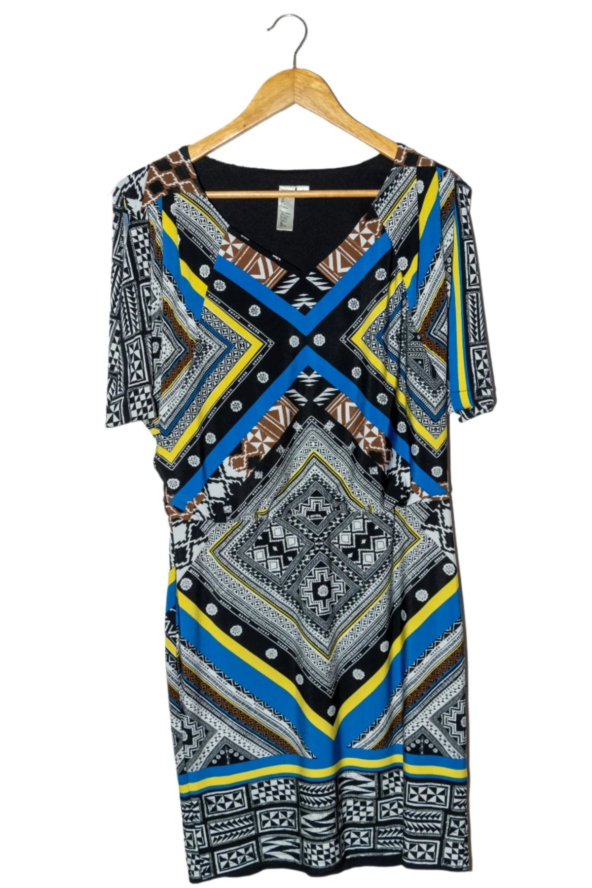 Vestido Emma & Michele estampado tribal tonos blanco, negro, amarillo y azul, cintura elástica, forro interior. Busto: 100cm, cintura: 74cm, largo: 90cm.