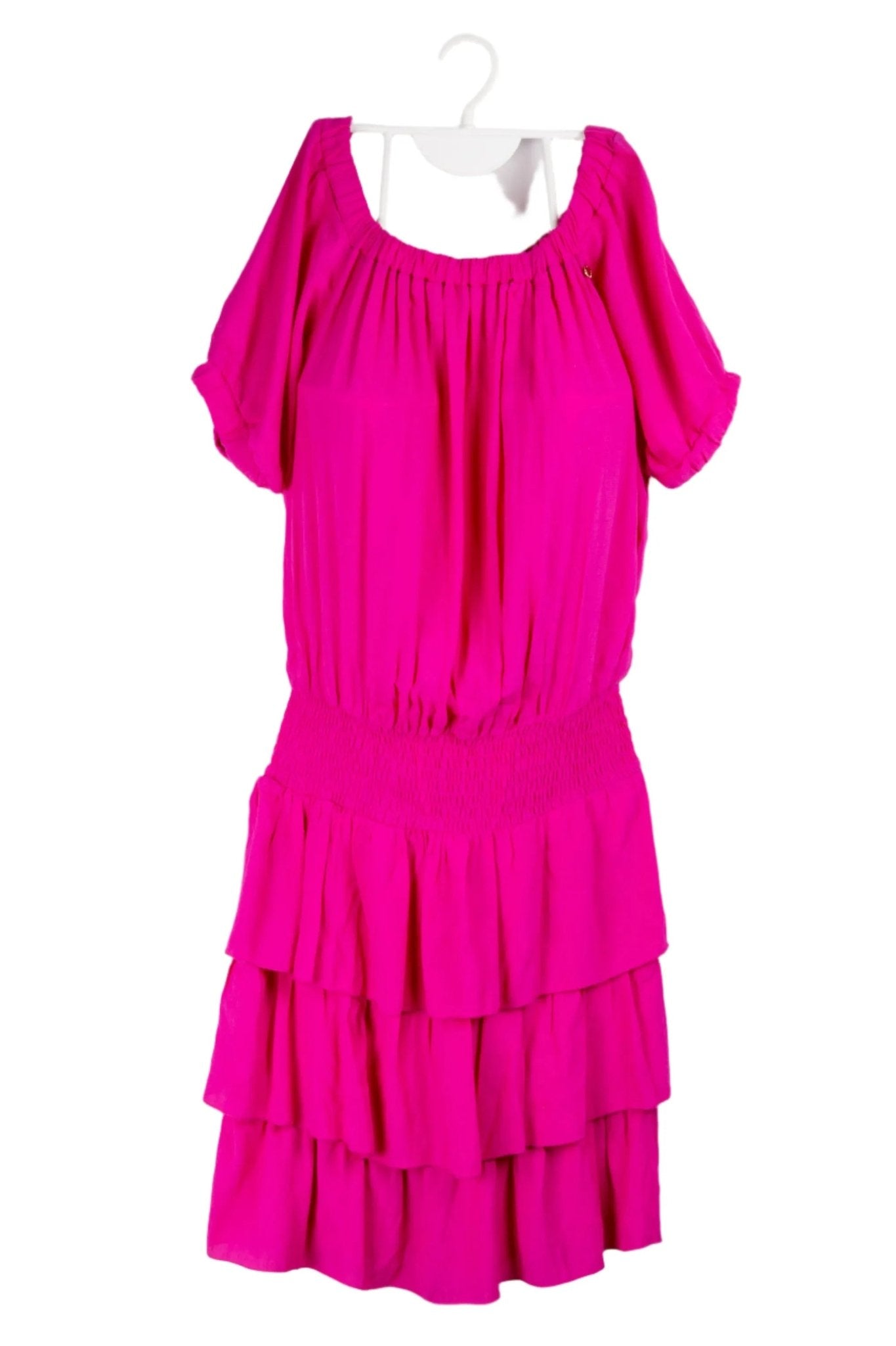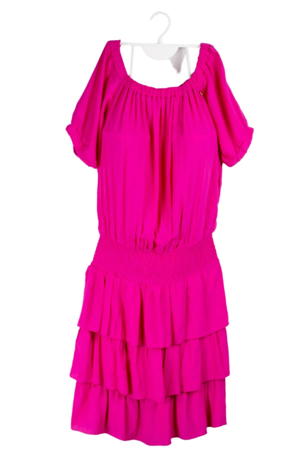 Vestido fucsia Rinascimiento off shoulder con panal de abejas en cintura y volantes. Precio original S/400. Busto 110cm sin estirar, Largo 100cm.