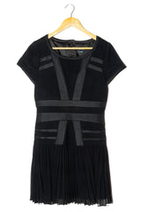 Vestido Marciano negro forrado, cortes geométricos en tela con textura de panal, bajo de gasa plisada, cierre dorado posterior. Busto 88cm sin estirar, Largo 80cm. Precio original $250