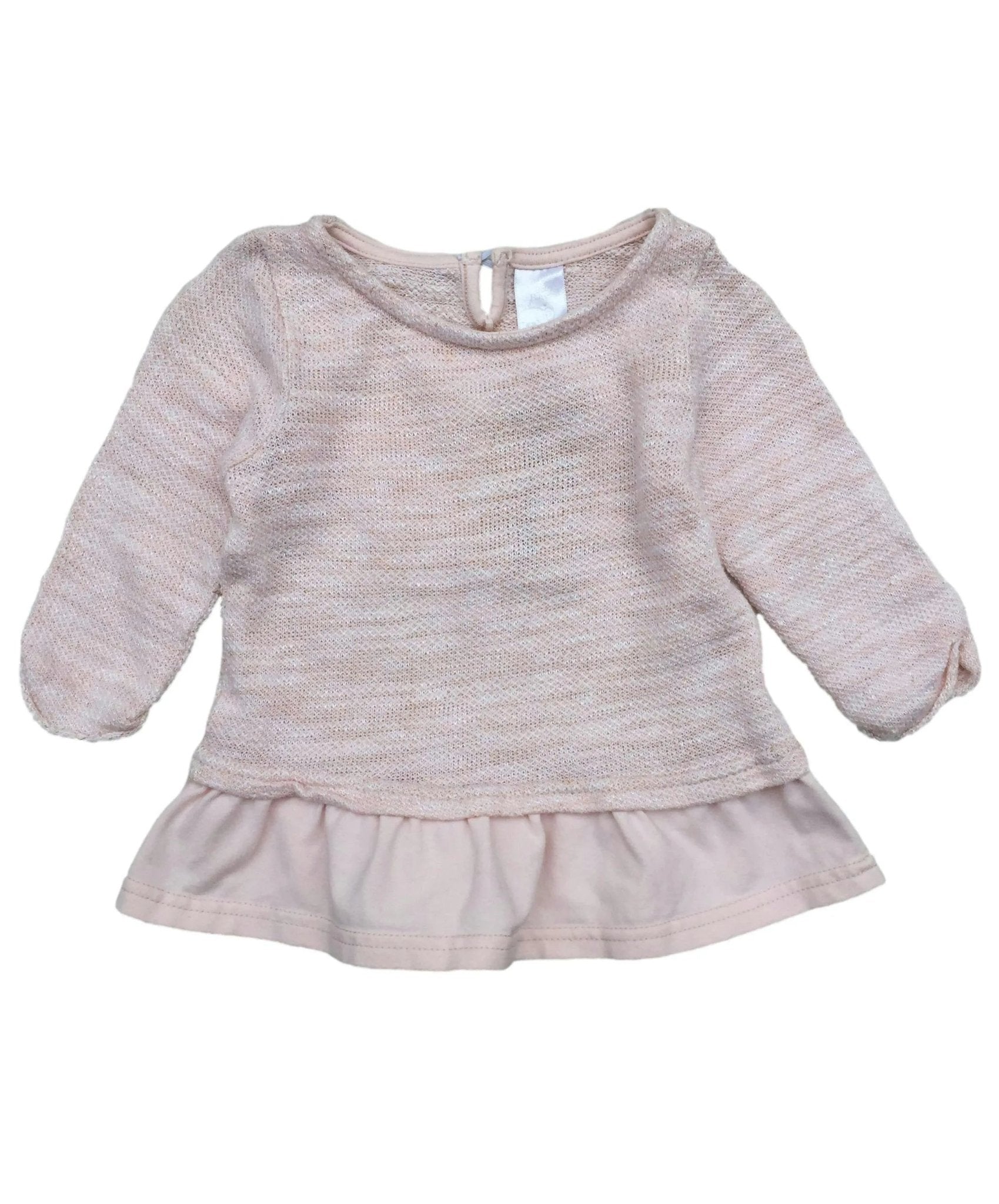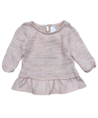 Vestido rosa pastel, tela de punto con hilos dorados, manga larga ,volantes en basta y botón posterior.