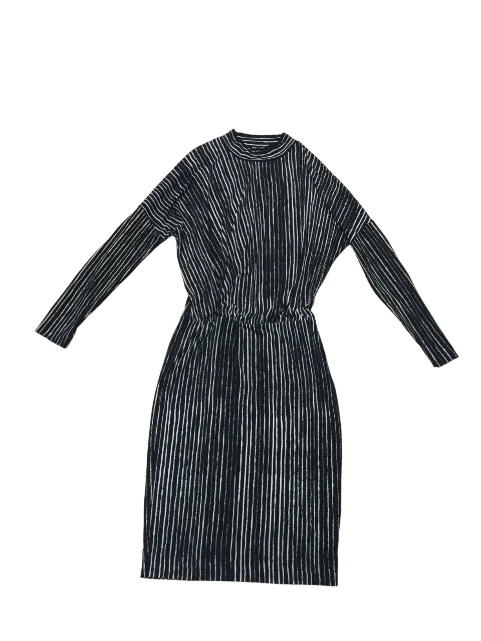 Vestido Vintage 90's. Falda pegada y parte superior suelta. Negro con líneas blancas, stretch, elástico en cintura, forro interno inferior. Busto: 120 cm, Largo: 117 cm